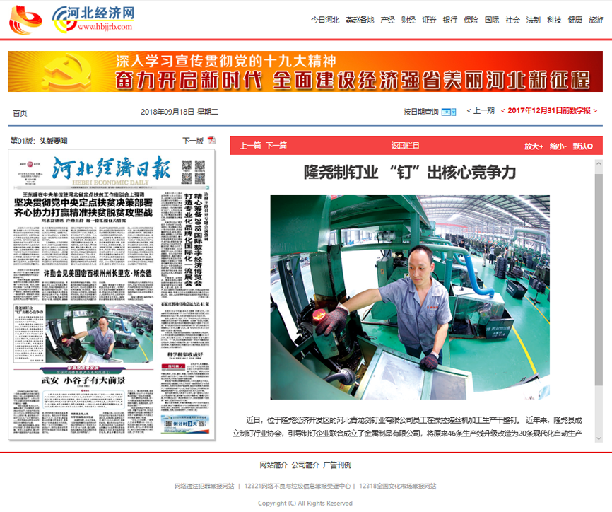 點贊!青龍劍釘業(yè)被《河北經濟日報》頭版要聞