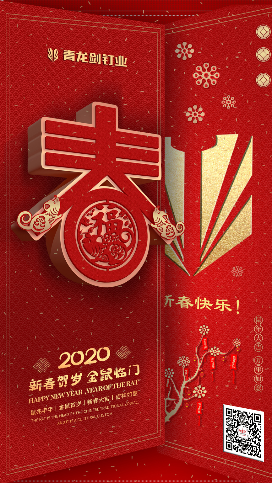 歲序常易,華章日新。當(dāng)時(shí)光穿越年輪,邁向2020新春佳節(jié),中華大地因納其盛世靈氣而芳澤毓秀,在這個(gè)充滿激情與期望的時(shí)刻,青龍劍釘業(yè)全體人員向所有關(guān)心關(guān)愛(ài)青龍劍公司發(fā)展的社會(huì)各界同仁、全國(guó)的經(jīng)銷商和用戶朋友們致以親切的節(jié)日問(wèn)候和誠(chéng)摯的新春祝福!
