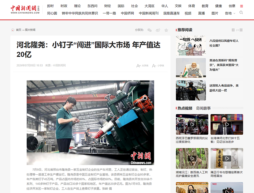 近日,中國新聞網(wǎng)記者走進(jìn)河北隆堯青龍劍釘業(yè)有限公司,對制釘車間的生產(chǎn)工序及車間環(huán)境進(jìn)行了解和拍攝。7月9日下午,青龍劍釘業(yè)榮登中國新聞網(wǎng)。