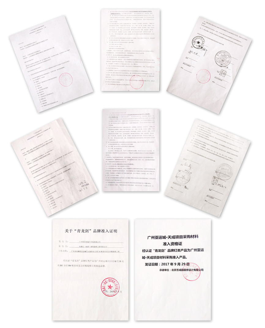 近日,收到廣州利合房地產(chǎn)發(fā)來的“青龍劍”品牌釘類產(chǎn)品在廣州亞運(yùn)城項(xiàng)目成功入選的相關(guān)材料,青龍劍被列入工程項(xiàng)目中指定品牌釘類產(chǎn)品。